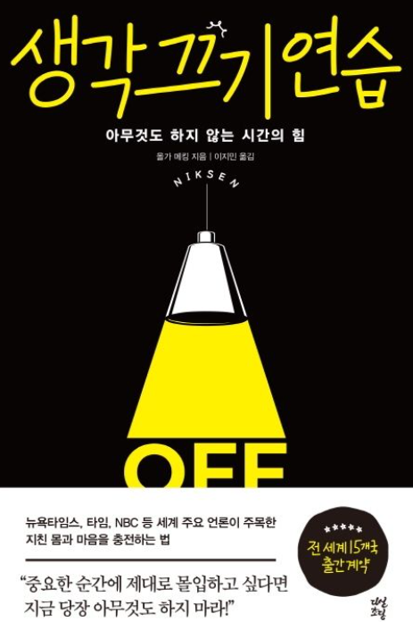 《생각 끄기 연습(Niksen: Embracing the Dutch Art of Doing Nothing)》은 네덜란드 작가, 언론인, 번역가인 브래드 올가 메킹의 작품이다. 이 책은 그녀의 닉센(Niksen)에 대한 10년 연구 성과의 결정체다. 정말로 아무것도 하지 않고, 생각조차 하지 않는 시간이 삶에 긍정적인 영향을 미친다는 것을 증명하고, 실제 삶에서 닉센을 실천하는 방법을 제시한다. 이 시간은 온전히 나로 있게 되며, 몸과 마음을 건강하게 충전하게 된다. 이 책을 이해하려면 닉센의 개념을 먼저 알아야 한다. '닉센'은 네덜란드어로 '아무것도 하지 않는 것'을 의미한다. 휴식, 원기회복, 자기 관리의 수단으로 아무것도 하지 않거나 단순히 빈둥거리는 것이다. 이 책에서 다루는 주요 주제는 다음과 같다. 첫째로, 네덜란드에 문화적 뿌리를 두고 있는 닉센의 개념과 그것이 마음 챙김과 명상과 같은 다른 방법들과 어떻게 다른지 설명한다. 또한 스트레스 감소, 창의력 증가, 정신적 명료성 향상을 포함하여 닉센의 이점을 설명한다. 둘째로, 의도를 가지고 닉센의 순간을 만드는 전략, 일과에 닉센을 포함하는 전략 등 일상생활에서 닉센을 포용하는 방법에 대한 실제적인 지침을 제공한다. 셋째로, 죄책감, 생산성 죄책감, 지속적으로 바쁜 사회적 압력과 같은 닉센과 관련된 오해와 문제에 대해 설명한다. 이러한 도전을 극복하면서 건강하고 균형 잡힌 방식으로 닉센의 개념을 수용하는 방법에 대한 통찰력을 제공한다. 마지막으로 저자의 개인적인 사례들과 각자의 삶에서 닉센을 포용한 사람들과의 인터뷰를 제시함으로써, 다양한 생활 방식과 문화에 통합될 수 있도록 돕는다. 이 책은 우리의 바쁜 삶에 잠시동안 생각을 멈추는, 닉센이라는 방법을 제시함으로써 사람들이 자신의 삶의 다양한 요구에 대해 균형을 맞추는 삶을 살도록 한다.