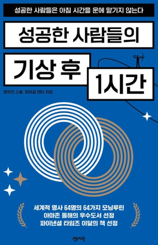 《성공한 사람들의 기상 후 1시간(My Morning Routine: How Successful People Start Every Day Inspired)》는 미국의 작가이자 인터뷰어인 벤자민 스폴의 대표작이다. 이 책은 각자의 분야에서 성공한 세계적 명사 64명의 아침 일과에 대한 인터뷰와 거기서 얻은 노하우 및 통찰력을 제공한다. 또한 이를 바탕으로 생산성과 웰빙을 향상하기 위한 팁과 전략을 제공한다. 명사에는 기업가, 예술가, 운동선수, 다른 분야의 지도자 등 다양한 분야가 포함된다. 각자의 상황에 따라 모닝 루틴은 가지각색이었지만, 모두들 결코 아침 시간을 그냥 흘려보내지는 않았다. 하루를 시작할 때 목적, 에너지, 영감을 가지는 것이 매우 중요함을 강조한다. 각장은 기상 시간, 운동 습관, 명상이나 마음 챙김, 아침 식사 선택, 아침에 통합하는 다른 의식이나 활동을 포함하는 그들의 아침 일과를 공유하는 인터뷰가 기록되어 있다. 제시된 노하우들을 보면 다음과 같다. 첫째로 의도와 생산성을 가지고 하루를 시작하기 위해 일찍 일어나는 것이 중요하다. 둘째로 에너지, 기분, 전반적인 웰빙을 증진시키기 위해서는 운동과 신체 활동이 중요하다. 셋째로 명확한 정신과 집중력을 증진시키기 위해서는 마음 챙김과 명상을 실천해야 한다. 넷째로 건강하고 영양가 있는 하루의 시작을 위해 올바른 식사 선택과 영양 습관을 가져야 한다. 다섯째로 아침 일과는 개인의 취향과 라이프스타일에 맞춰져야 한다. 여섯째로 아침을 잘 살기 위해서는 전날 저녁부터 의도적이 되어야 한다. 일곱 째로 루틴을 때로는 잘 지키지 못했다고 하더라도 나를 좀 더 다정하게 대해야 한다. 다만 실패해도 포기해서는 안 된다. 심지어 여행이나 출장 중에도 지속해야 한다. 이렇게 의도적이면서도 구조화된(루틴화된) 아침 시간이 중요한 것은 다양한 삶의 영역에서 생산성, 웰빙, 전반적인 성공을 향상할 수 있기 때문이다. 책에는 개념뿐만 아니라 다양한 실용적인 팁을 제공하고 있다. 이는 성공과 웰빙을 위해 아침을 최적화하려는 사람들에게 매우 소중한 자료이다.