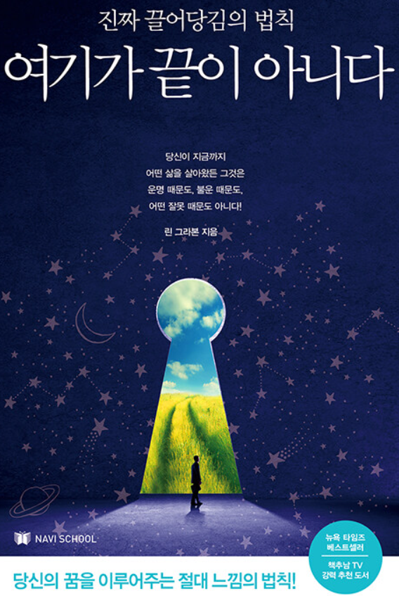 《여기가 끝이 아니다(Excuse Me, Your Life Is Waiting: The Astonishing Power of Feelings)》는 미국 작가이자 동기부여가인 린 그라본의 대표작이다. 간절히 원했지만 그것이 이루어지지 않은 이유는 바로 '느낌(감정)' 때문이다. 생각이 아닌 느낌으로 창조하는 것이다. 억지로 노력하거나 마음을 컨트롤한다고 해서 이루어지지 않는다. 느낌은 진동이며, 유사한 진동의 상황/사물 혹은 사람을 끌어당기는 자석과 같은 역할을 한다. 이것이 우리가 흔히 알고 있는 '끌어당김의 법칙'이다. 삶의 매 순간마다 다양한 느낌이 생긴다. 조울증 환자는 양극단을 오가기도 한다. 이런 느낌은 우리 삶 대부분의 영역에서 의식적, 무의식적으로 큰 영향력을 행사한다. 따라서 삶을 원하는 대로 바꾸고 싶다면 먼저 느낌을 내가 원하는 느낌으로 바꿔야 한다. 먼저는 내가 지금 부정적인 느낌의 상태임을 인식해야 한다. 대부분 스스로 그런 부정적인 느낌의 상태인지 잘 모른 채 살아간다. 인식했다면 현재 상황과 상관없이 즐거움이나 행복과 같은 좋은 느낌으로 살기로 결심하면 된다. 이 방법은 복잡하지 않으면서도 즉시 효과를 볼 수 있는 방법이다. 구체적으로는 다음의 4단계와 같이 하면 된다. 1단계에서는 원하지 않는 것을 찾고, 2단계에서는 원하지 않는 것을 바탕으로 원하는 것을 찾는다(이 부분은 간다 마사노리의 책 《비상식적 성공법칙》과 유사하다). 3단계에서는 원하는 것의 느낌에 집중하고, 마지막 4단계에서는 원하는 것이 현실이 될 거라 기대하고 귀를 기울이고 받아들이기만 하면 된다. 다만 이때 현재의 결핍 상태를 바라보지 않아야 한다. 책에는 우리의 삶에 행운을 불러들이는 구체적인 30일 변화 프로그램까지 제시하여 쉽게 삶에서 실천할 수 있도록 했다.