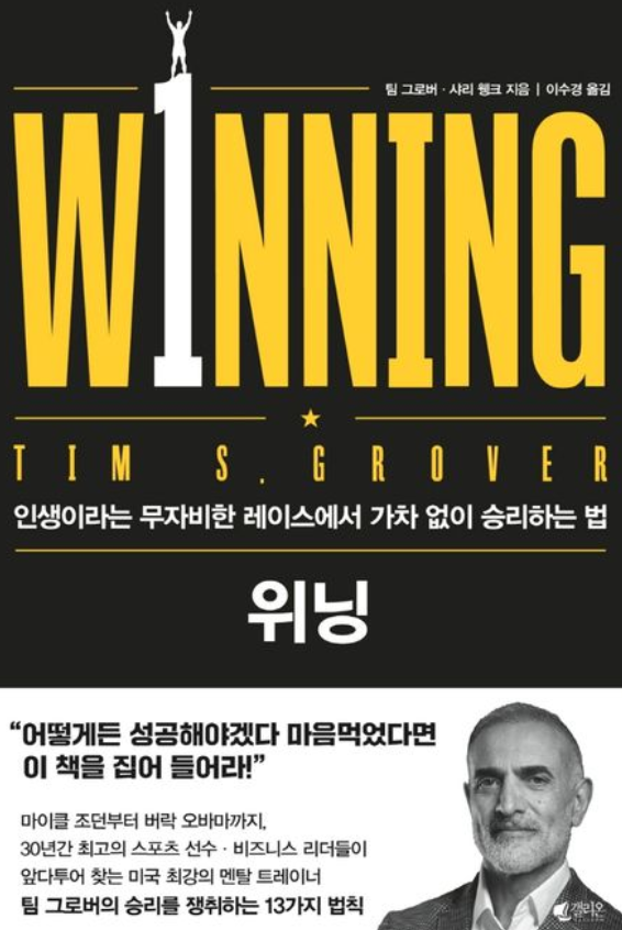 《위닝(Winning: The Unforgiving Race to Greatness)》은 미국의 개인 트레이너이자 작가인 팀 그로버의 대표작이다. 이 책은 스포츠 혹은 다른 분야에서 자신의 삶에서 위대한 성취를 얻기 위한 13가지의 법칙을 다음과 같이 제시한다. 승리는 사소한 차이에서 결정된다. 승리는 마음속을 전쟁터로 만든다. 승리는 스스로를 건 최고의 도박이다. 승리는 비정하지도 따뜻하지도 않다. 승리는 다른 이의 손에 있는 그것을 빼앗아오는 일이다. 승리는 당신의 전부를 원한다. 균형이란 없다. 승리는 이기적이다. 승리는 지옥의 질주다. 중간에 포기하면 영원히 지옥에 떨어진다. 승리는 정답이 없는 시험이다. 승리는 당신의 모든 비밀을 알고 있다. 승리는 절대 거짓말하지 않는다. 승리는 마라톤이 아니다. 결승선이 없는 단거리 레이스다. 승리는 모든 것이다. 책에서는 이 13가지 법칙 앞에 모두 1을 붙였는데, 이는 13가지 법칙이 모두 중요함을 강조한 것이다. 어떻게 생각하면 승리를 추구하는 다른 책과 마찬가지로 사고방식, 경쟁자, 그리고 다양한 승리의 요소를 설명한다. 다만 이 책은 훨씬 더 현실적이고 직설적이다. ‘야만적이고, 혹독하고, 지독하고, 더럽고, 거칠고, 살벌하고, 무자비하고, 거침없다’와 같은 말들이 난무한다. 예전에 서장훈도 청춘 페스티벌에서 말했던 것처럼 즐겨서는 안 된다고 말한다. 즐겨서 되는 것은 아무것도 없다고 말한다. 책의 제목처럼 위대함(greatness)을 추구한다면, 즐기면서 해도 괜찮다는 말은 정말 말도 안 된다고 한다. 그래서 저자는 변함없는 헌신, 위험을 감수하려는 의지, 실패에서 회복할 수 있는 능력, 항상 개선하려는 의욕을 말한다. 왜냐하면 승리는 모든 것이기 때문이다. 그럴 때 이 책에서 제시한 구체적인 전략을 수행할 수 있게 된다. 승리는 나의 모든 것을 요구한다.