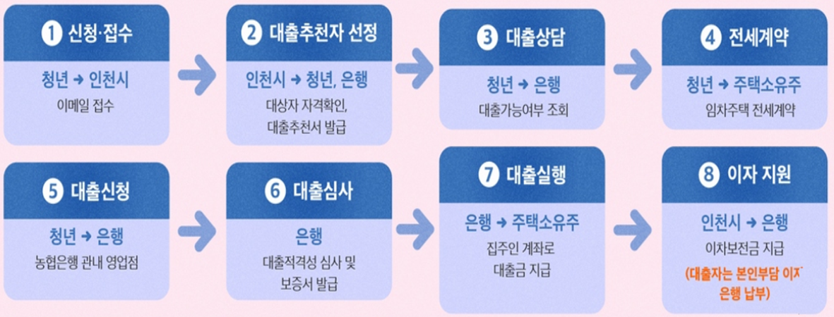 본인부담금리 = 현재 대출금리 – 인천시 지원금리(연 2%) 따라서 현재 6%라면, 4%로 낮아지게 됩니다. 다만 현재 금리 정책이 변동금리와 고정금리에 따라 최종 본인이 부담해야 할 금리는 달라집니다. 접수마감일로부터 3주 이내에 문자로 결과를 알려드리며, 이메일로 받으신 대출추천서를 출력하여 은행 방문시 제출하시면 됩니다.