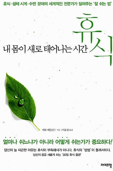 《휴식: 내 몸이 새로 태어나는 시간(The Power of Rest: Why Sleep Alone Is Not Enough)》은 미국의 의사이자 작가인 벤자민 매튜 에들런드의 대표작이다. 원제에서 알 수 있듯, 그는 수면만으로는 부족하다고 말한다. 다른 말로 수면과 휴식은 다르며, 수면 외에 휴식을 취하는 것이 필요하고 중요하다는 것이다. 삶에서 휴식과 휴식을 우선시해야 신체적, 정신적, 정서적 건강을 유지할 수 있다. 휴식의 형태는 명상과 단순히 일이나 다른 스트레스가 많은 활동으로부터 벗어나는 것 등 다양하다. 구체적으로 휴식에는 정신적, 사회적, 영적, 육체적 휴식이 있다. 정신적 휴식은 지성을 자신의 환경(눈에 보이는 이미지나 소리, 머릿속에 그리는 이미지 등)에 집중함으로써 원기를 회복시키는 방식으로, 더 많은 집중력과 성취를 가능하게 한다. 사회적 휴식은 사회적 유대를 통해 긴장을 이완시키고 원기를 회복하는 것으로 소속감과 단란함의 감정을 느끼게 한다. 사회적 유대는 고혈압을 억제하고 금연만큼 건강에 좋다. 영적 휴식은 명상이나 기도를 통해 자신보다 더 크고 위대한 존재와의 연결을 추구하는 것으로, 내적인 균형을 잡아주고 편안함을 느끼게 해 준다. 육체적 휴식은 몸과 몸의 가장 단순한 생리적 과정에 집중하여 차분함을 느끼는 것으로, 건강을 향상하는 데 도움이 된다. 특히 육체적 휴식에는 심호흡, 짧은 낮잠, 낮에 하는 목욕 등이 좋다. 실제로 제대로 된 휴식 후에는 면역 기능이 향상되고, 스트레스 수준이 낮아지며, 건강이 전반적으로 향상된다. 심지어 일에서도 더 생산적이고 높은 수준의 성과를 내기 위해서는 휴식을 우선시해야 한다. 이 책에서는 잘 쉬기 위한 30일 프로그램을 제안하고, 구체적인 세부 지침을 통해 이를 실천하도록 돕는다.