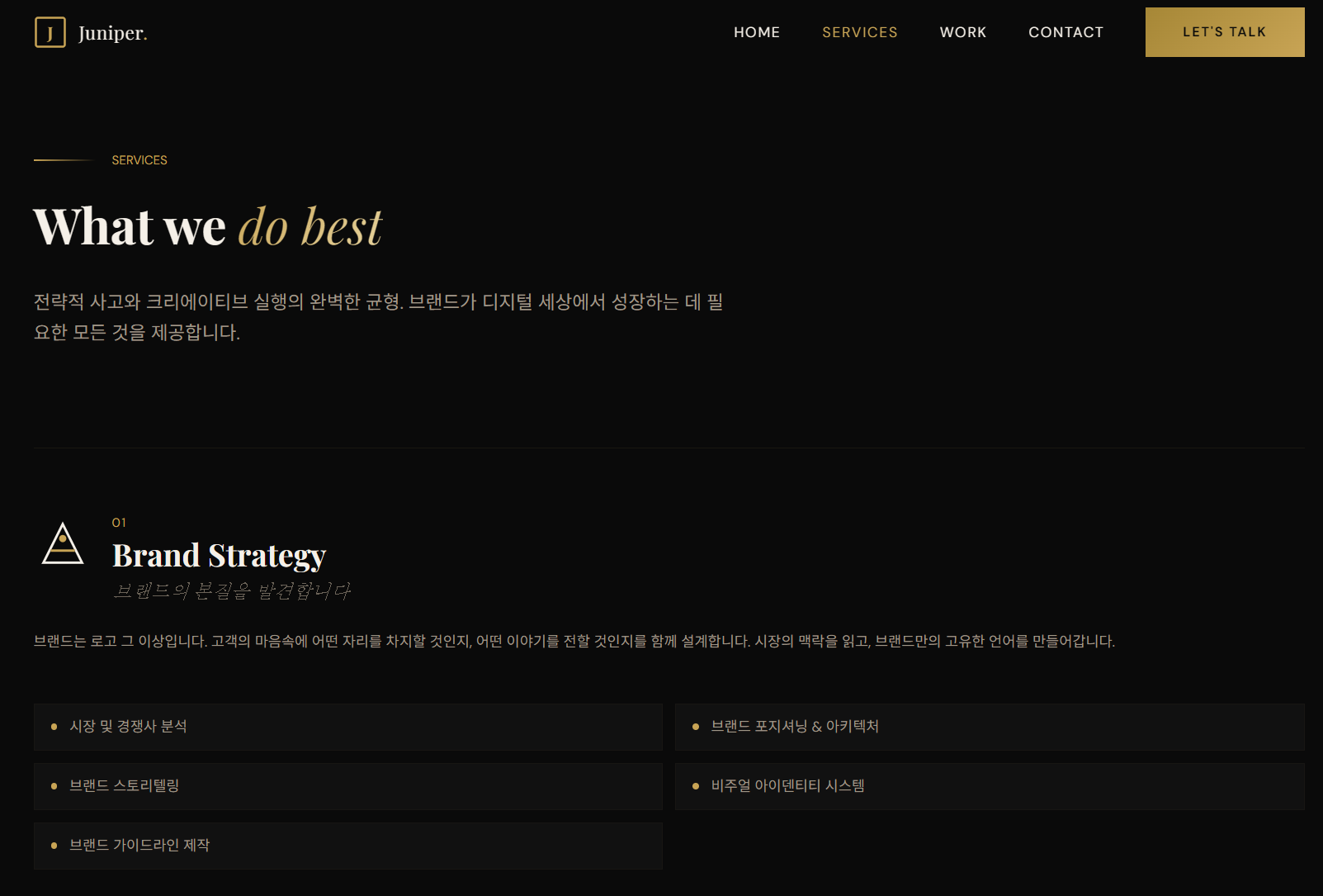 (Hero, Features, Testimonials, Services, Locations, Footer 등)으로 구성해줘.