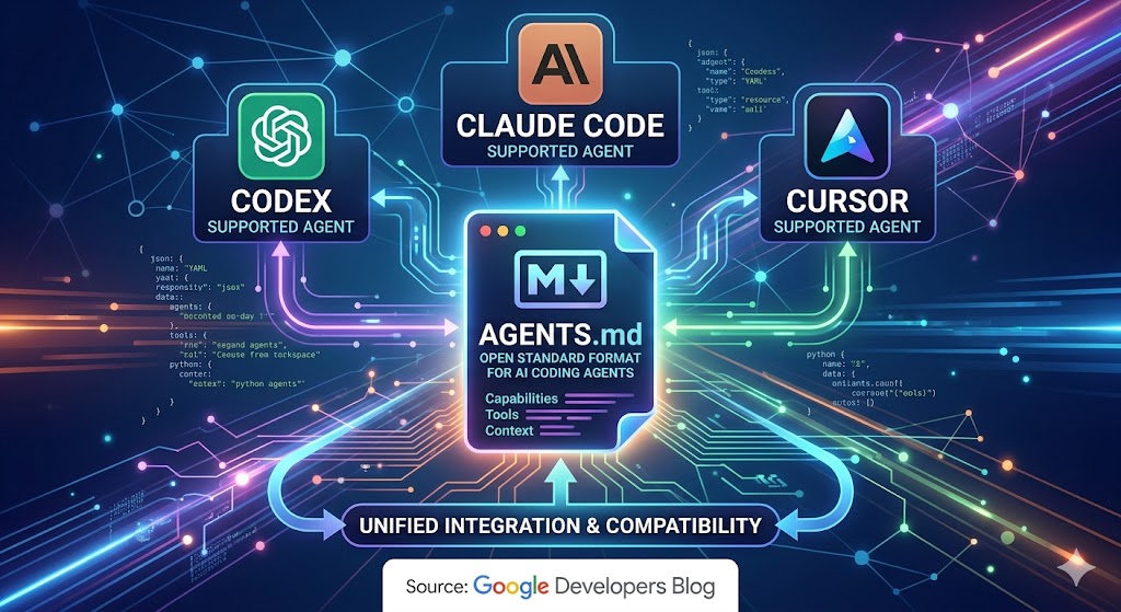 ▲ AGENTS.md는 Codex, Claude Code, Cursor 등 주요 AI 코딩 에이전트에서 공통으로 지원되는 오픈 표준 포맷이다