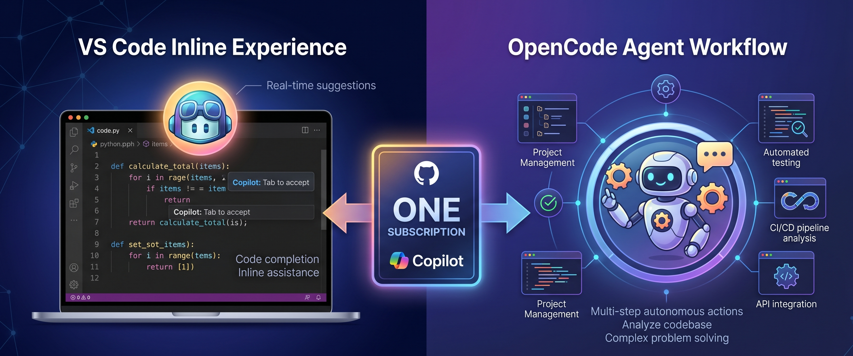 ▲ GitHub Copilot 구독 하나로 VS Code 인라인 경험과 OpenCode 에이전트 작업을 모두 사용할 수 있다