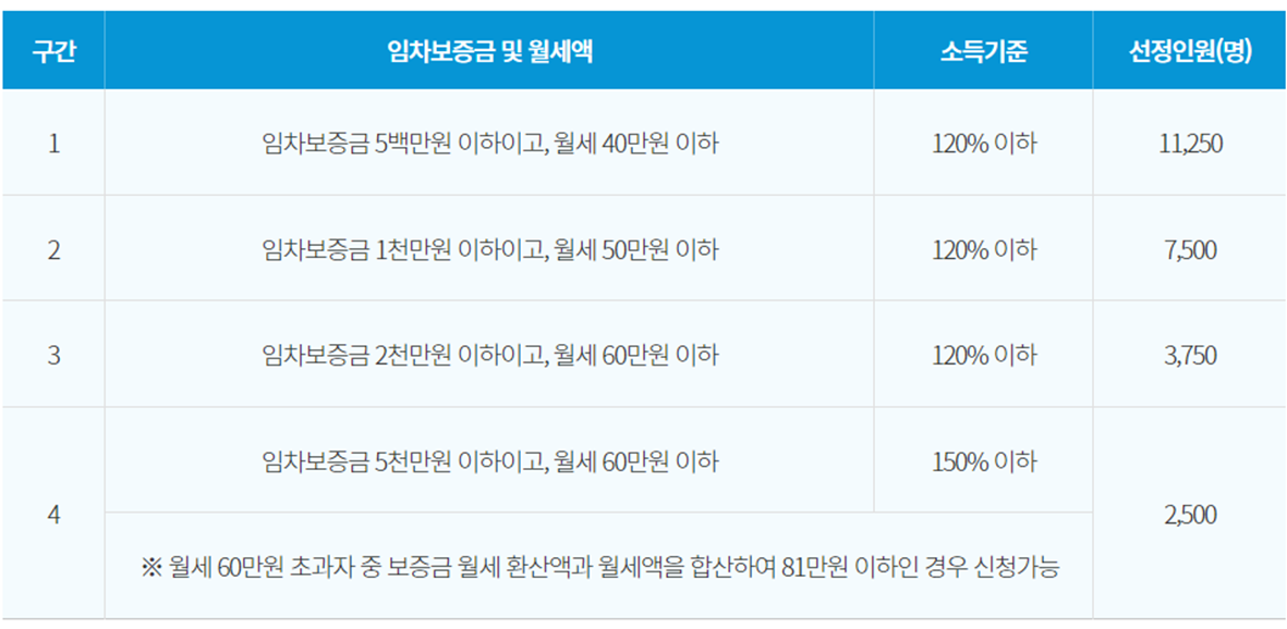 월세가 60만원이 넘더라도 보증금 월세 환산액(환산율 5.25%)과 월세액을 합산해 81만원이 되지 않으면 신청 가능합니다.
